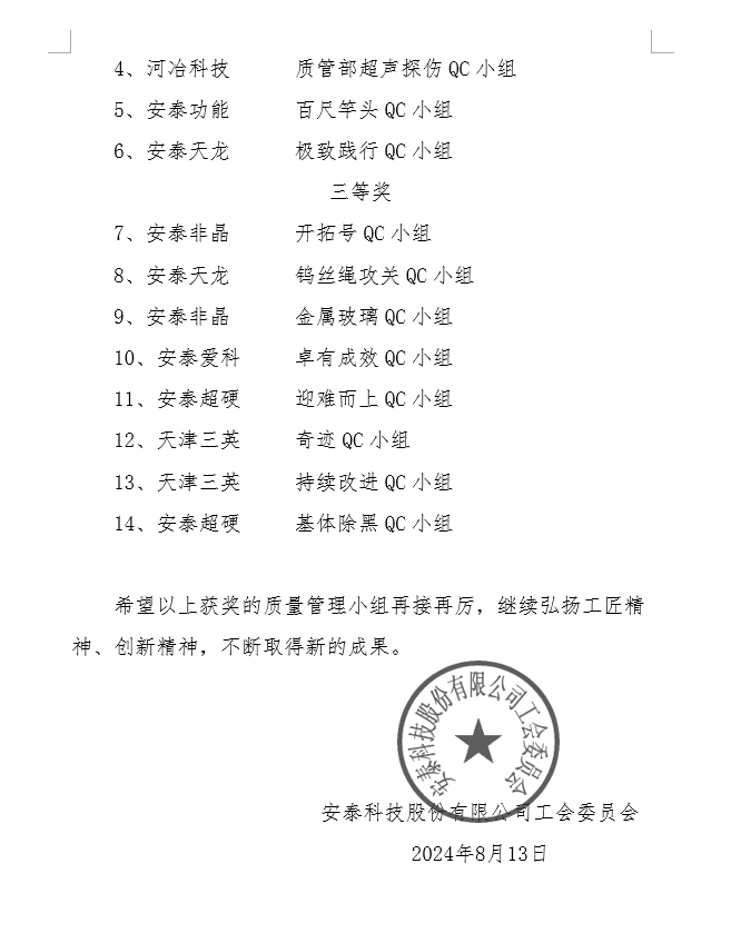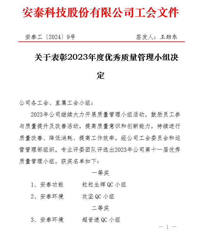 為鼓勵(lì)員工參與質(zhì)量提升及改善活動(dòng),提高質(zhì)量意識(shí)和創(chuàng)新能力,持續(xù)進(jìn)行質(zhì)量改善、降低消耗、提高工作效率,河冶科技-質(zhì)管部超聲探傷QC小組榮獲中央企業(yè)、北京市優(yōu)秀質(zhì)量管理小組三等獎(jiǎng), 2023年安泰科技第十一屆優(yōu)秀質(zhì)量管理小組二等獎(jiǎng)。